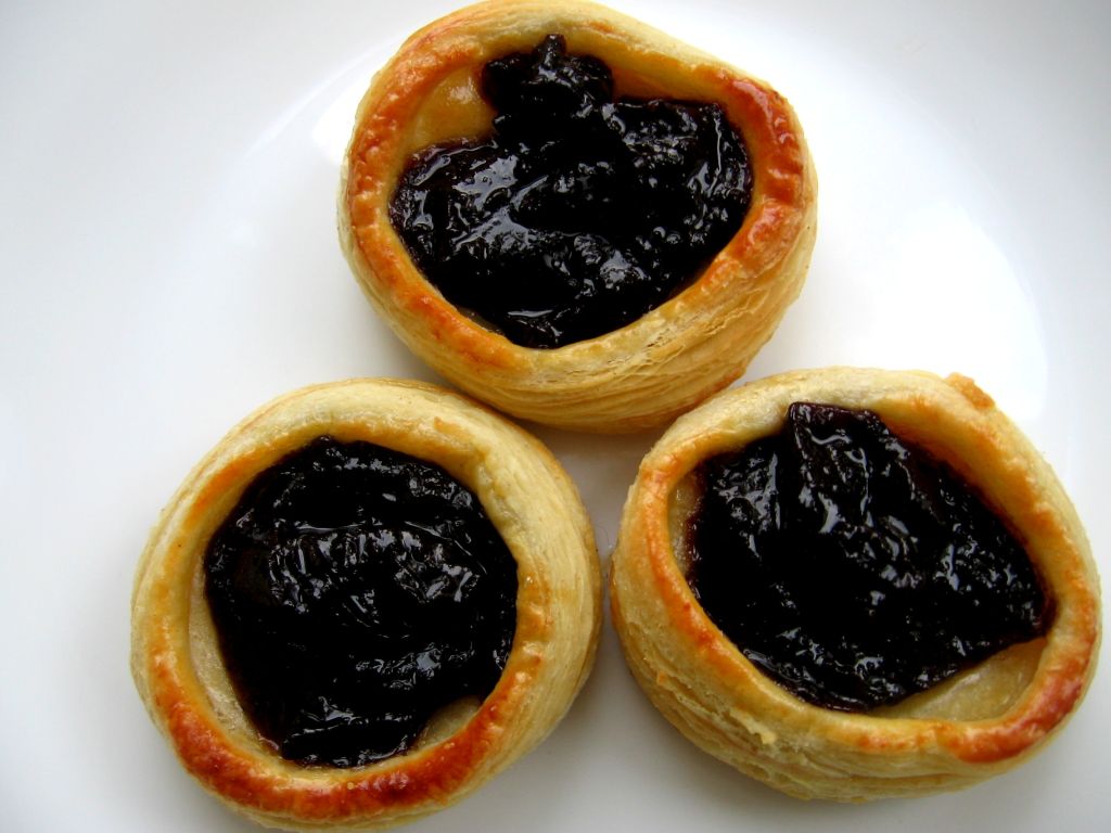 Plāksni atlaidina, nedaudz parullē plānāku un ar lielāko glāzi izspiež 6 apļus. 3 apļiem izspiež vidiņus ar mazāko glāzi. Lielos apļus liek uz pannas, pārziež ar sakultu olu, pārliek mīklas gredzenus, tā lai tie precīzi sakristu ar maliņām, pārziež ar olu. Viducītī ar kaudzi liek ievārījumu, kurš cepot neiztek (es šim nolūkam pērku gatavos, kuriem ir norādīts, ka der cepšanai) un cep 200g līdz maliņas pacēlušās un nobrūnējušas.